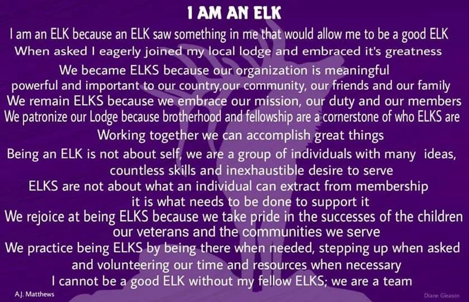 Elks to join us at our regular meetings at 6:00 pm. Meetings are held at the Lodge on the 2nd Monday of each month.